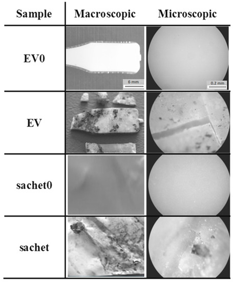The studied samples observed under the optical microscope (magnification 100×) before incubation had a smooth surface. After the composting process, the macro- and microscopic changes of the EV sample and sachet surfaces were observed, and are presented in Figure 10.