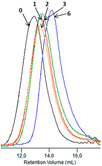 The GPC experiments for the samples studied were conducted in a chloroform solution at 35 °C and at a flow rate of 1 mL/min using a Viscotek VE 1122 (Malvern, Worcestershire, UK) pump with two Mixed C PLgel styragel columns (Agilent, Santa Clara, CA, USA) in series and a Shodex SE 61 RI detector (Showa Denko, Munich, Germany). A volume of 10 μL of a chloroform sample solution (concentration 0.5% m/V) was injected into the system. The instrument was calibrated using polystyrene standards with a low dispersity.