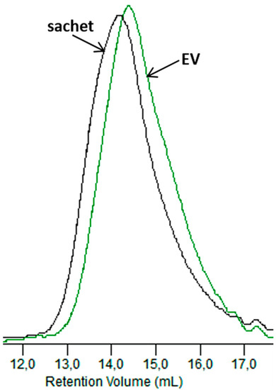 GPC elugrams of the sachet and EV samples after 6 weeks of the industrial composting process.