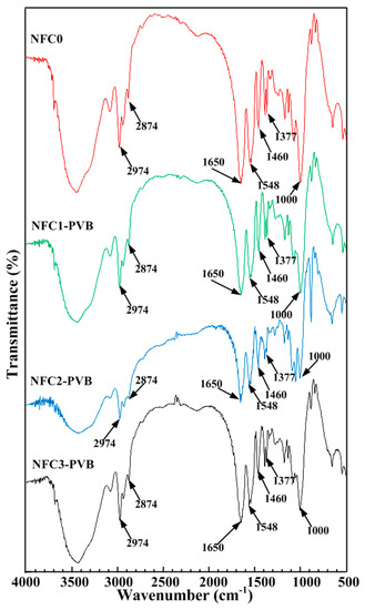 Typical FT-IR spectra characteristics of PVB-containing hydrogels with various NFC contents.