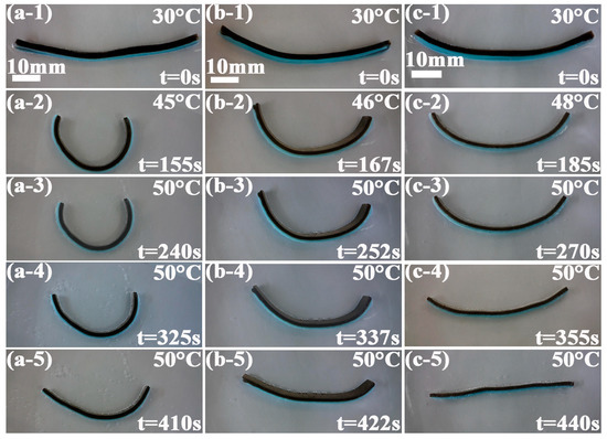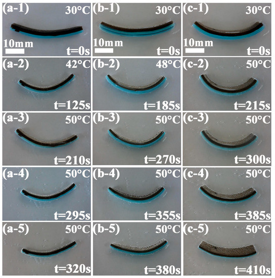 Thermoresponsive characteristics of (a-1)–(a-5) NFC1–PVB, (b-1)–(b-5) NFC2–PVB, and (c-1)–(c-5) NFC3–PVB bilayer hydrogel systems with dimensions of 70 mm × 5 mm × 4 mm (Length × Width × Thickness) at poikilothermy temperatures ranging from 30 to 50 °C.