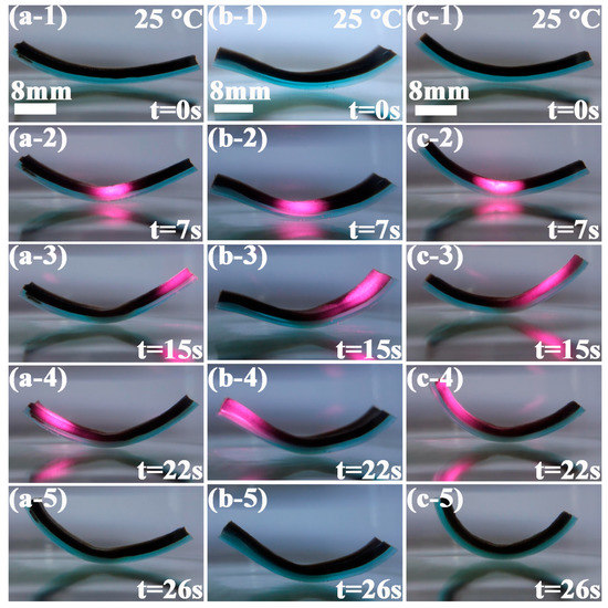 Thermoresponsive characteristics of (a-1)–(a-5) NFC1, (b-1)–(b-5) NFC2, and (c-1)–(c-5) NFC3 of PVB nanofibers-containing bilayer hydrogel systems with dimensions of 40 mm × 8 mm × 4 mm (Length × Width × Thickness) at poikilothermy temperatures ranging from 32 to 50 °C.