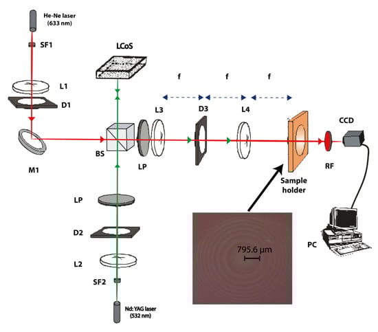 2, and the analyzing arm, using a wavelength of 633 nm (at which the material does not absorb), provided by a He-Ne laser. Along the recording arm, the LCD was sandwiched between two polarizers (P), which were oriented at the appropriate angles (45° the first one and −45° the other) to produce amplitude-mostly modulation with a contrast of 20. A 4-F system was used to image the intensity transparency displayed on the reflective LCD onto the recording material. To generate the diffractive lenses, we used an LCoS-Pluto provided by Holoeye (LCoS, HOLOEYE Photonics AG, Berlin, Germany) with a resolution of 1920 × 1080 (HDTV) pixels and a pixel size of 8 × 8 μm