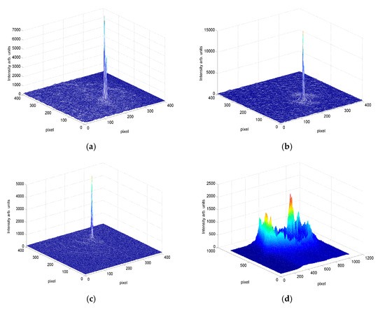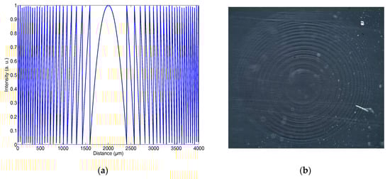 Figure 2a shows a 4-mm-diameter lens. In this Figure, just at the borders (the external part of the diffractive optical element, DOE), the distance between two consecutive maximums is less than 40 µm; in other words, five pixels to describe one ring. Furthermore, we know that there is crosstalk between two consecutive pixels, and this also affects the ring shape. Thus, with greater DOE diameters, at this focal length, it is impossible to reproduce the desired intensity distribution properly using our display due to the resolution limit. This result can produce an increase in the focal length of the recorded DOE.