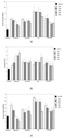 Effect of plasticizer type and concentration on the tensile strength (a), elongation (%) at break (b) and Young’s modulus (c) of LMP films.