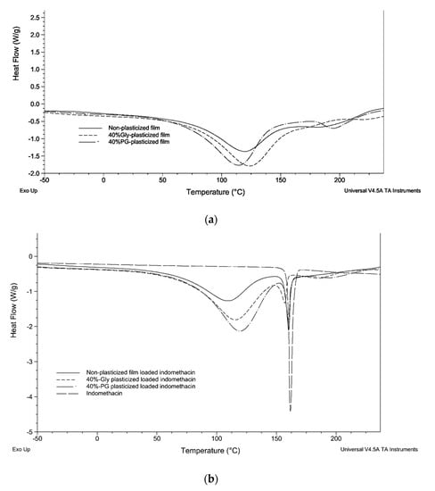 DSC curves of plasticized and non-plasticized LMP pectin films are presented in Figure 3. When pectin films were analyzed between −50 and 175 °C, no Tg nor melting peak were observed, which indicated the totally amorphous structure of the films. However, a broad endothermic peak was observed around 115 °C. This endothermic behavior is linked to the evaporation of water entrapped in the pectin matrices [,]. The changes in enthalpy (ΔH) in endothermic peaks which are calculated by integrating the areas below the DSC curves and endothermic peak temperatures (EPTs) are shown in Table 2. EPTs of non-plasticized, Gly-plasticized and PG-plasticized films without indomethacin were not significantly different. For 40% PG-plasticized film, the peak around 190 °C, which was propylene glycol boiling temperature, was observed (Figure 3a). Pectin films, when incorporating a plasticizer (Gly or PG), were found to absorb more thermal energy (371.2 ± 7.6 and 390.4 ± 6.2 J/g, respectively) than pectin films without any plasticizers (238.8 ± 1.8 J/g). The increase in ΔH values of plasticized films may be due to the hygroscopic character of both glycerol and propylene glycol, which tends to provide additional water into the film. The plasticizer type affects significantly the changes in enthalpy since propylene glycol seems to promote water incorporation in pectin films. If the amount of water in the film is proportionally correlated to the number of hydrogen bonds between the pectin matrix, the plasticizer and water molecules, then, the high amount of water incorporated in PG-plasticized films may explain the highest Young’s modulus values of PG-plasticized films.