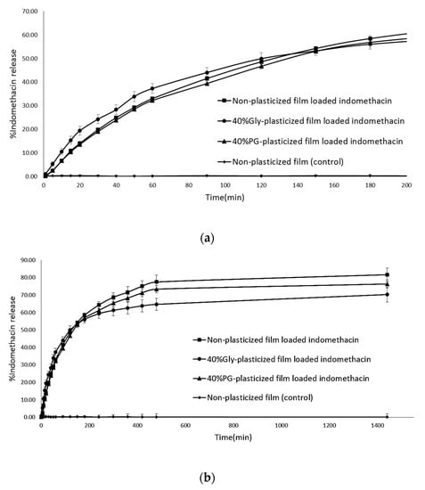 The mechanical properties of film formulations containing a drug are a crucial factor not only during the production or development, but also regarding the proper handling by the patient. Thus, the effect of the incorporation of the drug in the plasticized matrix can be interesting. Tensile strength, % elongation at break and Young’s modulus values of LMP films containing indomethacin were presented in Table 1. For example, % elongation at break of non-plasticized, 40% Gly-plasticized and 40% PG-plasticized films that loaded indomethacin were 10.91%, 26.50% and 21.17%, compared to 13.24%, 32.75% and 27.23% for films without indomethacin, respectively. The plasticizer–polymer interactions may be interrupted by the incorporated indomethacin and reduced the film elongation. Indomethacin has functional groups such as benzoyl (C=O) and carboxylic (–COOH) groups. These groups may also interact with pectin chain resulting in the increasing of Young’s modulus value.
