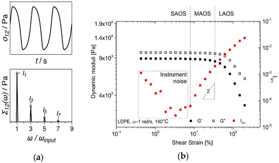 (a) Illustration of a nonlinear material shear stress response and the occurrence of (odd) higher harmonics in the corresponding Fourier spectra; (b) Variation of the dynamic moduli and third relative higher harmonic, I3/1, during a strain sweep test on the pure LDPE sample.