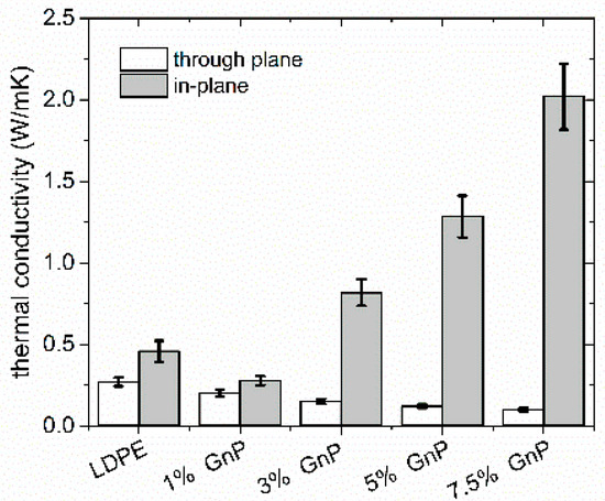 Figure 5 shows thermal conductivity of the LDPE-GnP nanocomposites and of pure LDPE, as a reference. One can observe an increase of thermal conductivity along extrusion direction for all the measured and for the sample filled with 7.5 wt % of GnPs, the increase was as large as 388%. However, for samples measured through plane, a slight decrease of thermal conductivity was obtained. As expected, the strong anisotropy has been the reason, where creation of conductive paths along extrusion direction is very efficient. In general, thermal conductivity of the GnP nanocomposites depends on various factors, such as polymer morphology and its crystallinity, thermal conductivity of the polymer, thermal conductivity of GnP, GnP shape, flatness ratio, surface quality and levels of exfoliation and agglomeration [50,51]. In addition, one of the most important parameters is the quality of the interface between the polymer and the filler. As thermal energy in polymers and carbon fillers is conducted through phonon scattering processes, poor contact at the interface and weak bonding between GnP and polymer matrix leads to the increase of thermal resistance at the interface (Kapitza resistance RK) [52]. The resistance at the interface is related to the mismatch between phonon vibrational spectra of LDPE and GnP [52,53]. Therefore, interfacial scattering processes of phonons between GnP and LDPE are much stronger in perpendicular direction due to much bigger interface area as for parallel direction. Backscattering process of the phonons may also occur, yielding the decrease of effective thermal conductivity. Moreover, thermal conductivity of graphene flakes and graphite is well known as highly anisotropic (see Table 1). The strong sp2 bonding between carbon atoms causes high in-plane thermal conductivity, whereas through plane heat flow can be limited by weak van der Waals bonding. The anisotropy of thermal conductivity is however also visible also for reference pure LDPE sample and results from polymer chains stretch during the extrusion process [54].