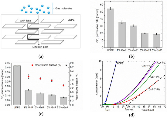 Schematically shown tortuous path of gas diffusion through a LDPE-GnP extruded nanocomposite (a); permeability of nanocomposites for CO2 (b); permeability of nanocomposites for SF6 and their free volume fractions (c); dependence of accumulated SF6 leakage (d) for LDPE-GnP nanocomposites concentration (tLDPE and tGNP7.5% indicate respectively delays in onset of permeation for pure LDPE and 7.5 wt % GnP samples).