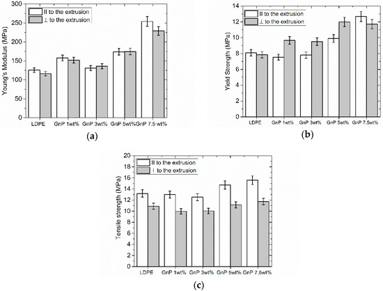 Figure 9 illustrates comparison of stress–strain curves for neat LDPE as compared with the nanocomposites samples, showing the impact of extrusion [27,57]. As the shear stress applied during the processing leads to strong alignment of GnP flakes along extrusion direction as well as orientation of polymeric chains, the maximum strain in both directions (in extrusion direction and perpendicular to it) decreases while the tensile strength increases with increasing filler content (see also Figure 8). This behavior is related to the decrease of available free volume as well as polymer chains mobility. In consequence the composites become more rigid.