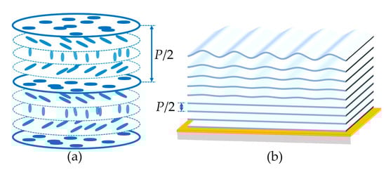 The intrinsic self-assembly of helical structure endows cholesteric liquid crystals (CLCs) the ability to form periodic structure with broadly tunable feature size. The generation of the CLC grating is strongly dependent on the anchoring condition. There are three different modes. In the homogeneous cell [,,,,,], which is composed of two substrates with parallel alignment, the LC molecules spontaneously organize into planar helical layers with the helical axis perpendicular to the substrates. As illustrated in Figure 1a, the helical pitch P is defined as the length of one turn of the helical structure. When a proper electric field is applied, the helical axis turns over and subsequently a CLC grating is resulted (Figure S1a). CLC gratings can also be formed in homeotropic cells [,,,], which is assembled by two vertically aligned substrates (Figure S1b). For the hybrid alignment cell with one substrate planarly aligned and the other one vertically aligned [,,,,], helical layers are periodically distorted near the vertically aligned substrate, while layers adjacent to the opposite substrate maintain planar. Thereby, the CLC grating is generated due to the periodic distortion (Figure S1c). All these CLC gratings have merits of easy fabrication, cost efficiency, and high sensitivity to external stimuli [,,,,,], which makes them promising in wide applications, such as diffraction grating [], non-mechanical beam steering [,], polarization-dependent lithography [], etc. Recently, CLC gratings in semi-free films which break the spatial confinement have attracted intensive attention [,] due to their superiorities in sensors and micro-manipulations.