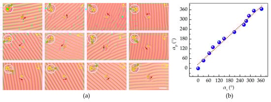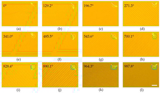 After the CLC mixture with 1 wt % ChAD-3c-S was spin coated, the CLC grating (initial state) was obtained in a thin semi-free film (Figure 2a). Such CLC films and developed gratings are stable for several days at room temperature under atmospheric condition, but they still suffer from fluidity and dust contamination. The equilibrium helical pitch (Pi) is ~2.3 μm (i.e., 1/Pi ~0.43 μm−1), which is measured by the traditional Grandjean–Cano method []. The grating pitch (Λi) was measured as ~5.2 μm. Under the irradiation of blue light, the chiral molecular switch isomerizes, modifying the HTP and subsequently changing the layer configuration. As presented in Figure 2a–l, along with the exposure increasing, the CLC grating rotates anticlockwise and eventually fades out (end state). The initial and the end grating orientations (ϕ) are 135° and 1122.8° (relative to the horizontal axis, the same direction of alignment), respectively. That means that the total continuous rotational angle αt of 987.8° was achieved, which is larger than any reported results []. Reverse rotation processes can be accomplished by heating or green light exposure. The rotational direction can be switched between clockwise and anticlockwise by changing the incident light (green and blue light, Video S1). The rotational speed is dependent on both the light intensity and the dopant concentration []. In the wavelength range of 450–490 nm, the absorbance of SD1 is quite low. And, SD1 molecules are much less sensitive to unpolarized light compared to linearly-polarized light. Therefore, in our experiment, a relatively weak and unpolarized blue light was chosen for both acquiring the details of the grating rotation and guaranteeing the quality of alignment.
