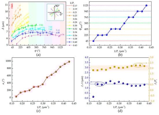 Figure 3a shows the dependencies of the grating pitch Λ and ϕ on the dopant concentration (labeled by 1/Pi). The initial orientation ϕi was measured once the CLC grating is formed, which is in the range of 0° to 180° as depicted in the inset of Figure 3a. The end orientation ϕend was determined when the grating was disappearing (Figure S2). The total continuous rotational angle is defined as αt = ϕend − ϕi. Other values of ϕ (Figure 3a) were selected during the exposure process. Because the contrast of CLC gratings with small 1/Pi is too low to determine the Λ, we present the experimental results from 1/Pi = 0.17 μm−1. On the basis of the above data, several rules can be concluded. First, as expected, larger 1/Pi induces smaller Λ. Second, ϕi is random, while ϕend = (1/4 + n)π (n = 0, 1, 2, …,6), which is clearly exhibited in Figure 3b. Third, αt is directly proportional to 1/Pi (Figure 3c). Fourth, when 0.17 μm−1 ≤ 1/Pi ≤ 0.30 μm−1, αt is smaller than 9π/4 and Λ monotonically increases with the exposure; when 0.32 μm−1 ≤ 1/Pi ≤ 0.43 μm−1, αt is larger than 9π/4 and Λ will reach and maintain at the maximum Λmax. The grating pitch is determined by the synergy of elastic force, chiral strength, and anchoring energy. We assume that the anchoring energy is constant. When 1/Pi is larger than 0.32, although P keeps increasing, the influences of ChAD-3c-S isomerization on the elastic force and the chiral strength become balanced. This results in the grating rotation and the maintenance of Λmax. Fifth, as revealed in Figure 3d, the ranges of the grating pitch tuning △Λ are all around 1.38 μm, except for △Λ = 0.15 at 1/Pi = 0.17 μm−1 (may be because of a very short time irradiation of blue light). Sixth, the value of Λi/Pi is in the range of 1.8 to 2.3 (Figure 3d), which is smaller than that of a hybrid alignment cell []. This phenomenon is attributed to the weaker anchoring at the LC/air interface compared to the homeotropic alignment layer.