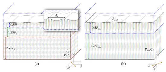 We simulate the director configuration of the semi-free film based on Baudry’s model []. According to the model, periodic distorted helical layers corresponds to 0.5P. Here, the initial and end director configurations of the sample (1/Pi = 0.43 μm−1) are constructed (Figure 4). The semi-free film thickness is set as D = 4.5Pi_0.43 (Supplementary Material 1), and other required parameters are also determined according to the calculation (Supplementary Material 2). Figure 4a vividly reveals the director configuration of the sample at the initial state. There are four pitches in the planar helical layers. A zoomed-in image of the distorted helical layers (0.5 pitch) is presented as an inset. Figure 4b exhibits the director configuration of the same sample at the end state. Compared with director configuration in Figure 4a, 2.75 pitches are unwound, which is consistent with αt_0.43/360°. There are still 1.75 residual pitches left at the end state.