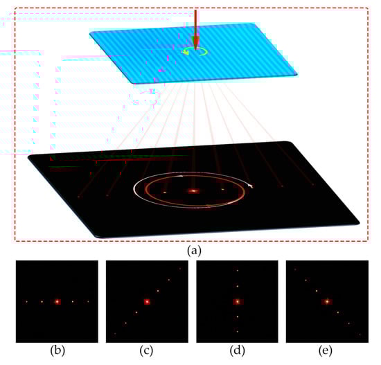 A 633 nm probe beam is normally incident to the sample of 1/Pi = 0.43 μm−1 to characterize the beam steering performance of the CLC grating. Circular polarization is adopted to avoid the influence of polarization-dependent effect on the diffraction efficiency. Figure 5a schematically shows the optical path for the characterization. The spiral line on the screen depicts the rotational trace of the 2nd diffraction order. At the beginning, the diffraction orders rotate and simultaneously move towards the central 0th order. Afterwards, they would rotate on several fixed concentric circumferences. Four typical photos are selected and exhibited in Figure 5b–e. The above phenomena agree with the results shown in Figure 3a. This facilitates a freely two-dimensional beam steering. Particularly, the rotation of diffraction orders with fixed radius is reported for the first time. It supplies a way for the precise control of beam propagation in a photoresponsive manner.