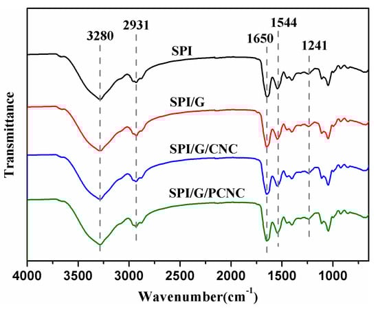 ATR–FTIR spectra of SPI film and SPI-based films modified with graphene, CNC, and PCNC.