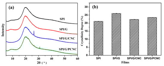 (a) XRD diffraction patterns and (b) crystallinity of SPI film and SPI-based films modified with graphene, CNC, and PCNC.