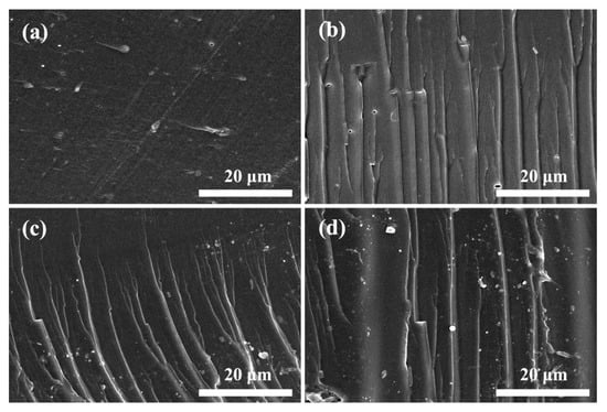 The fracture surface morphologies of SPI-based nanocomposite films were investigated by SEM observation (Figure 4). As shown in Figure 4a, the pristine SPI film displayed continuous, uniform, and homogeneous structure. Some tiny pores might be due to the evaporation of water during the casting process [35]. In comparison with the control film, the fracture surface of SPI/graphene films exhibited obvious multi-layered structures (Figure 4b), and this was attributed to the addition of graphene. These hierarchical structures were generated intra and inter layers in the films resulting from the corrugated configuration of graphene sheets [23]. After the incorporation of CNC, the cross-section analysis of the nanocomposite films gradually showed some tiny aggregation seemingly embedded in the SPI matrix (Figure 4c), which might be the effective combination of CNC segments [24]. This phenomenon indicated that CNC could be well dispersed within the SPI matrix via excellent interfacial interaction with graphene sheets, which is inconsistent with the report of Pal et al. that completely individualized CNC could act as a dispersing agent for the graphene sheets [25]. As shown in Figure 4d, the cross sectional morphology of SPI/graphene/PCNC film was rougher and the aggregation became even larger, and this is ascribed to the cross-linked network modified with PCNC [36]. This high degree of compact and dense network caused by the presence of long PCNC ridges might contribute to the arrest of sliding and shearing of the laminated structure, resulting in enhanced mechanical properties of SPI-based nanocomposite films [20].