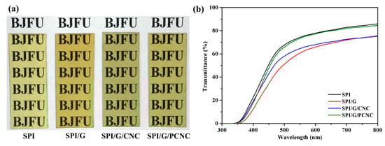 (a) Appearance photographs and (b) UV–Vis transmittance spectra of SPI film and SPI-based films modified with graphene, CNC, and PCNC.