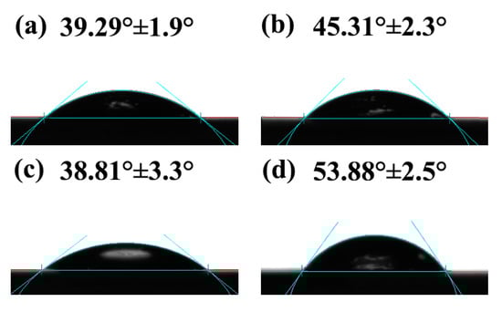 The surface hydrophilicity of SPI-based nanocomposite films was evaluated by measuring the water contact angles (WCA). As displayed in Figure 6, the untreated SPI film exhibited a relatively low WCA, which indicated its high hydrophilic property. This feature might be caused because SPI contains many polar amino acids, which resulted in a film that was more susceptible to high moisture [44]. In comparison with the control film, the WCA value of the SPI/graphene film was clearly increased from 39.29° to 45.31°, suggesting that the hydrophobic graphene layer was successfully transferred into the SPI substrate [45]. With the addition of graphene and PCNC, the WCA value of SPI-based nanocomposite film significantly increased to 53.88°, which might be attributed to the effects of hydrogen bonds and polar groups in the composite [40]. These results confirmed the favorable surface hydrophobicity of the SPI-based nanocomposite film modified with graphene and PCNC.