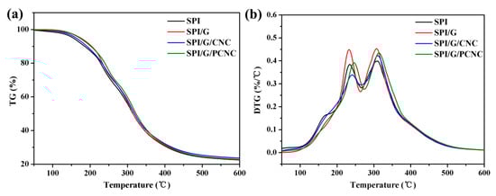 (a) Thermo gravimetric (TG) and (b) derivative thermo gravimetric (DTG) curves of SPI film and SPI-based films modified with graphene, CNC, and PCNC.