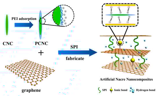 Here, we proposed a facile, inexpensive, and green approach to preparing stable aqueous graphene dispersions via sonication in bovine serum albumin (BSA) solution. A layer-by-layer (LbL) assembly technique was adopted to prepare SPI-based nanocomposite films. We assembled the strength and flexible 2D graphene sheets with a high aspect ratio 1D CNC component to produce active interfacial adhesion laminated nanocomposites. Due to the fact that CNC was prepared by the sulfuric acid hydrolysis method and possessed negatively charged sulfate ester groups, we modified the CNC with the cationic polyethyleneimine (PEI) to introduce positive charged surface functionalities via strong ion pairing with anionic graphene sheets to enhance the interfacial interactions among these components (Scheme 1). This strongly positively charged CNC could facilitate the strong ionic interactions with negatively charged graphene sheets for the effective dispersion and LbL assembly. Therefore, this novel SPI-based nanocomposite film exhibited enhancements in mechanical properties as well as water resistance. The microstructure, surface hydrophilicity, and thermostability of this composite film were also investigated.