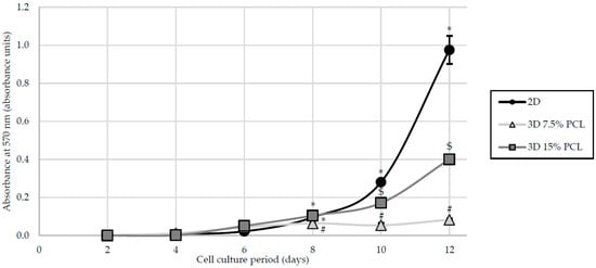 Cell proliferation analysis for MDA–MB–231 cells cultured on two-dimensional surfaces (2D) and on 7.5% and 15% PCL scaffolds (3D). (*), (#) and ($) symbols represent significant (p < 0.05) differences between groups.