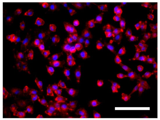 MDA–MB–231 cells grown in two-dimensional (2D) adherent coverslips. Actin cytoskeleton was stained with rhodamine-phalloidin (red) and nucleus was stained with 4,6-diamidino-2-phenylindole (DAPI; blue). Fluorescence microscopy images were captured at a magnification of 200× (Scale bar: 100 μm).