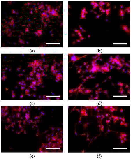 MDA–MB–231 cells grown in three-dimensional (3D) PCL scaffolds. Cells were seeded on 7.5% PCL (a,c,e) and 15% PCL meshes (b,d,f). Cells were cultured for 3 (a,b), 6 (c,d) and 12 days (e,f) without passage. Actin cytoskeleton was stained with rhodamine-phalloidin (red) and nucleus was stained with DAPI (blue). Fluorescence microscopy images were captured at a magnification of 200× (Scale bars: 100 µm).