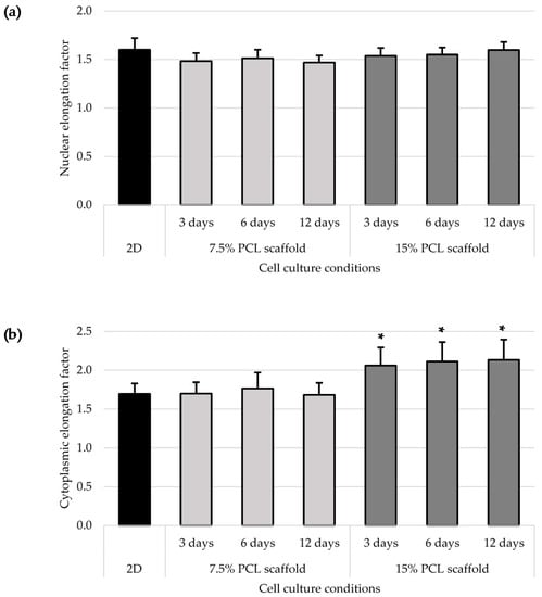 To quantitatively evaluate cell morphology in 2D and 3D cultures, nuclear and cytoplasmic elongation were measured as described in Section 2.7. No significant changes in nucleus elongation were observed between 2D and 3D cultures (Figure 4a), which agreed with the aforementioned descriptive microscopic observation. The nuclear elongation factor of 2D cultured cells was 1.60 ± 0.12, pointing out to the ellipsoidal form of the nucleus. All 3D cultured cells factors were similar or slightly lower, between 1.47 ± 0.07 and 1.60 ± 0.08. Cytoplasm pattern was also studied (Figure 4b) and, whereas MDA–MB–231 cells cultured on 7.5% PCL scaffolds presented a similar cytoplasmic elongation factor than those cultured in 2D, with a value around 1.70, the cells on 15% PCL meshes exhibited a significantly higher cytoplasmic length.