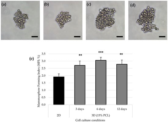 Mammosphere Forming Assay. Mammosphere images of MDA–MB–231 cells previously cultured on 2D surfaces (a) and 15% PCL scaffolds for 3 (b), 6 (c) and 12 days (d). (Scale bars: 50 μm). Mammosphere Forming Index (MFI) of MDA–MB–231 cell line after 2D or 3D cell culture with 15% PCL scaffolds (e). Significant differences of 3D with regard to 2D cultures are indicated as ** (p < 0.01) and *** (p < 0.001).