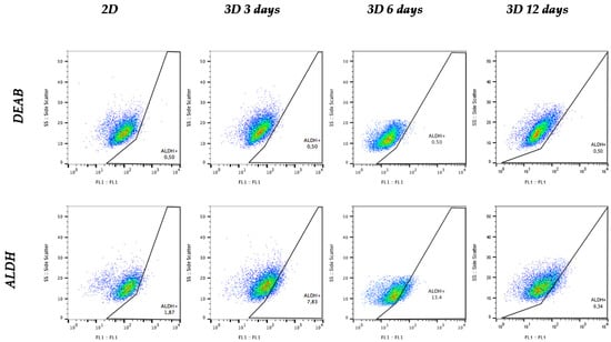 The aldehyde dehydrogenase (ALDH) family is composed by dehydrogenases enzymes responsible for the oxidation of retinol (vitamin A) to retinoic acid [31], the latter of which is involved in gene expression regulation [32] and embryo development [33]. Moreover, ALDH enzymes have a detoxification role, protecting organisms against damaging aldehydes [34] and cytotoxic agents [35], and have also been demonstrated to regulate hematopoietic stem cells differentiation via retinoic acids production [36]. To corroborate the relative proportion of CSCs in 2D and 3D cultured cells, ALDH activity was quantified as a measure of stem properties. Samples were assessed with ALDEFLUOR assay and the percentage of ALDH-positive cells was determined as shown in Figure 6.