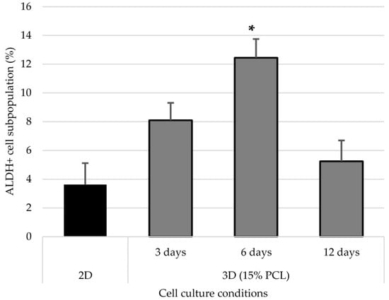 ALDH + cell subpopulation of MDA–MB–231 cells after monolayer culture (2D) or three-dimensional cell culture with 15% PCL scaffolds (3D). (*) Denotes significant (p < 0.05) differences between 3D culture at a given time point and 2D.