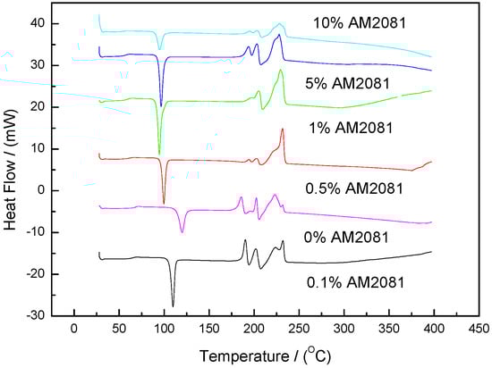Figure 3), no noticeable exothermal peaks were observed, thereby revealing that cross-linking polymerization is taking place at a very low rate. Considering the above results, it can be determined that the reaction process involves two steps: prepolymerization, since large amounts of prepolymers were produced during the initial reaction, and cross-linking, where cyanogen groups react and form triazine ring structures. The position of the peaks was dependent on the EP0408 or AM0281 contents. The activation energies (peaks at 115–120 °C) for the neat and the EP0408- and AM0281-containing polymers were 135, 129, and 778 kJ/mol, respectively. Thus, the AM0281-containing polymers react more easily at low temperatures compared to the other polymers. The DSC scans of the EP0408-containing polymers showed noticeable peaks at high temperatures (350–370 °C) (