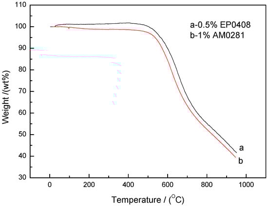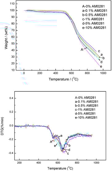 The TGA profiles of the EP0408- and AM0281-containing materials (0, 0.1, 0.5, 1, 5, and 10 wt %) are shown in