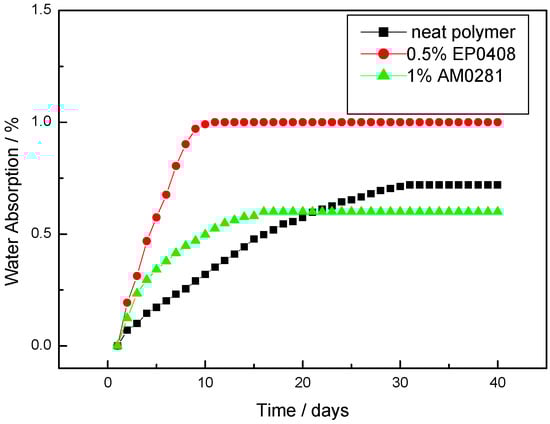 Figure 13. Saturated absorption conditions were reached after 31, 16, and 11 days for the neat polymer, phthalonitrile–EP0408 copolymer, and phthalonitrile–AM0281 copolymer, respectively. However, the amount of water absorbed at saturation did not follow this trend. Thus, the phthalonitrile–EP0408 copolymers showed the lowest saturation value among all the polymers tested (0.6%), whereas phthalonitrile–AM0281 showed the highest saturation value (1%), which was larger than that of the neat polymer (0.7%).