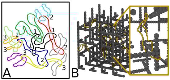 - Nechaev, S.K.; Semenov, A.N.; Koleva, M.K. Dynamics of a polymer in an array of obstacles. Physica A 1987, 140, 506–520. [Google Scholar] [CrossRef]