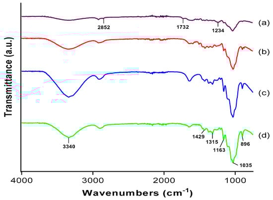 The FT-IR technique was carried out to study the functional groups present in OPMF and to examine the changes that occurred due to various treatments. Being lignocellulosic, OPMF is composed of mainly hemicellulose, lignin and celluloses, meaning that the main composition of the fiber includes alkanes, esters, aromatics, ketones, and alcohols with different oxygen-containing functional groups [19]. Figure 2 shows the spectra of (a) OPMF, (b) alkaline treated OPMF, (c) bleached OPMF and, (d) acid hydrolysed OPMF (CNC). The peaks at 3340 cm−1 in all of the spectra correspond to O–H stretching and reflect the tendency of OPMF to be hydrophilic [7]. The intensity of the peak inclines when treated with alkaline, due to the increase of OH concentration as the alkaline reduced the hydrogen bonding in cellulosic hydroxyl groups [20]. This reaction can also explain the diminishing of the peak at 2852 cm−1, present only in the spectrum of the OPMF which correspond to C–H stretching.