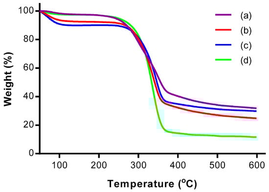 TGA measures the changes in weight of a sample as a function of temperature and/or time. The thermo-stability property of the sample prepared was analyzed by using Perkin Elmer Thermal Analyzer (Waltham, MA, USA). About 9 mg of sample was heated at a rate of 10 °C/min with nitrogen gas as carrier at flow rate of 50 mL/min. The weight percentage of residue was recorded to determine the weight losses of the sample after heating.