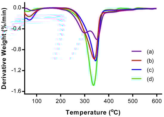Derivative thermogravimetric (DTG) thermograms of (a) OPMF, (b) alkaline treated OPMF, (c) bleached OPMF and (d) CNC.