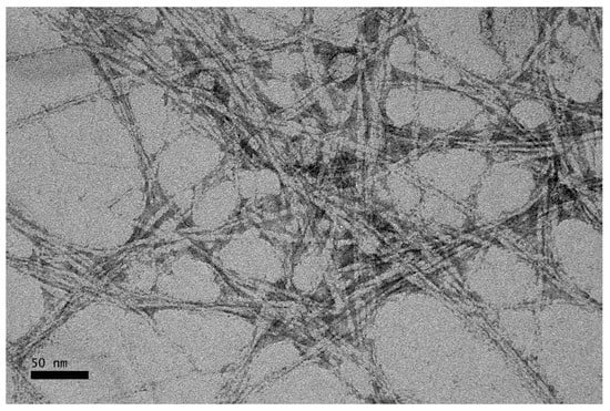 TEM was used to study the structure and size of CNCs produced from OPMF. CNCs were dropped in a 300-mesh copper carbon grid, draining the excess of water during sample preparation. The CNCs were contrasted with a 2% (w/v) uranyl acetate solution and analyzed by a JEOL (Tokyo, Japan) JEM-1011 transmission electron microscope.