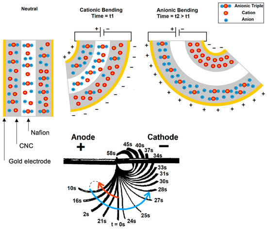 Upon fabrication, IPMCs are impregnated by optimum content [9] of ion-rich electrolyte, most often ionic liquids (ILs), as the source for mobilized ions. The operation principle of IPMC actuators is ultimately based on the accumulation of mobilized ions at the opposite electrodes in response to an externally-induced electric field. The difference between the volumes of cations and anions results in a volume imbalance and, therefore, mechanical stress, at the electrodes which, in turn, results in deformation of the IPMC structure toward the side with smaller volume. The motion of ions toward or away from each electrode is due to attractive or repulsive forces between the electrically-charged electrode and the ions, and can be reversed upon modulating the polarity of the electric field. The deformation depends on the net difference of the volumes at the electrodes. If the drift velocity of the cations and anions are significantly different, a two-step deformation is observed in which the actuator is initially bent toward one side, then toward the other side. Conventionally, the bending caused by cations (toward the anode) is called cationic bending and denoted by positive sign when that resulted by anions (toward the cathode) is called anionic and denoted by negative sign [10,11]. This change in the direction of motion is different from back-relaxation phenomenon [12,13,14]. A scheme showing the principle of actuation is presented in Figure 1.