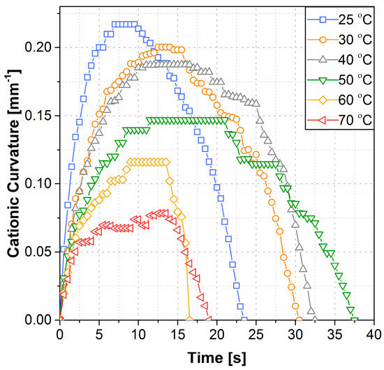 The cationic curvature as a function of time at 25 °C and for temperatures from 30 °C to 70 °C by 10-degree increments is shown in Figure 2. In this figure, the curvature is considered to be cationic as cations are dominating the bending process (i.e., the bending is toward the anode, as seen in Figure 1). After applying a step voltage, the cationic curvature increased to a maximum value and then decreased to zero as time progressed. The decrease in curvature resulted from the accumulation of bigger anionic clusters at the anode [10]. Both maximum cationic curvature and the cationic actuation time (the total time for the actuator to return to the neutral position) were affected as the system temperature increased, as shown in Figure 2. The maximum cationic curvature decreased for each temperature increment from 25 °C to 70 °C, as shown in Figure 3a. Meanwhile, the cationic actuation time (from the beginning of the motion back to the idle position) first increased to a maximum at 50 °C, with a sudden decrease at 60 °C, as shown in Figure 3b. No detectable bending occurred at temperatures higher than 70 °C.