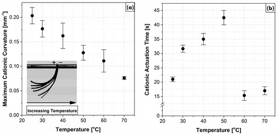 (a) The maximum cationic curvature; and (b) the cationic actuation time, at different temperatures.
