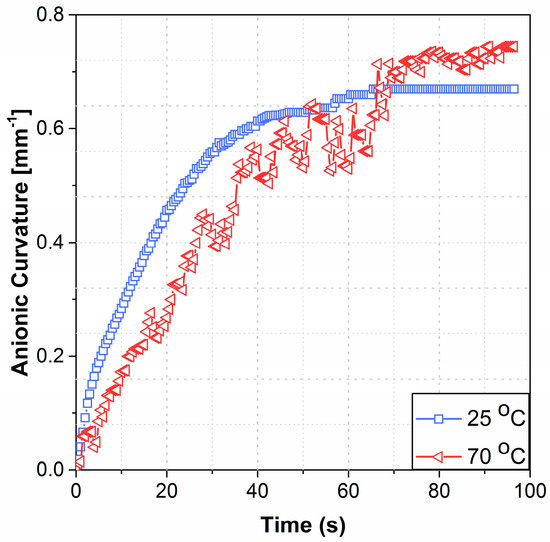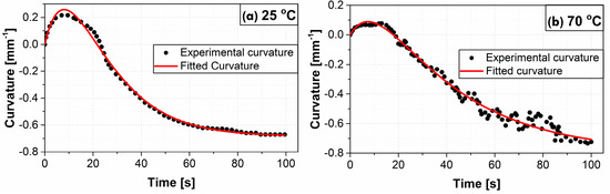 where k(t) is the net curvature as a function of time, kcat and kan are the cationic and anionic coefficients denoting the maximum value of each, t is the time, and and are the cationic and anionic time constants, respectively. Experimental data fitted with analytical curves for 25 °C and 70 °C are shown in Figure 6.