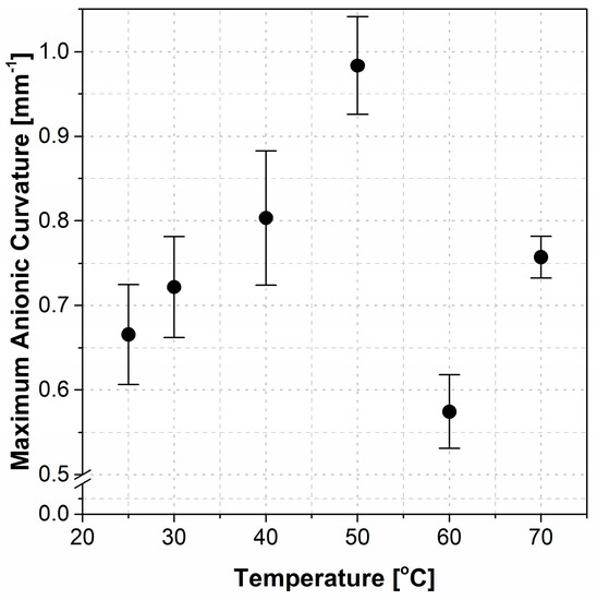 Anionic curvature increased to a steady-state maximum value at each tested temperature from 25 °C through 70 °C. The anionic curvature as a function of time exhibited smooth deformation for temperatures ranging from 25 °C to 50 °C (see Figure 4 for a representative example). However, the actuator deformation fluctuated noticeably past 50 °C and up to 70 °C. Anionic curvatures for 25 °C (smooth) and 70 °C (fluctuating) are shown in Figure 4. The two curves were shifted to the zero time to be compared side-by-side, see Figure 6 for the full actuation cycle data. The maximum anionic curvatures for actuators tested at 25 °C and for temperatures from 30 °C to 70 °C by an increment of 10 °C are shown in Figure 5. The maximum anionic curvature increased to a peak value as the temperature increased up to 50 °C and dropped abruptly after that. At temperatures above 70 °C, actuators only showed unpredictable oscillation at the idle position with no clear cationic or anionic curvatures.
