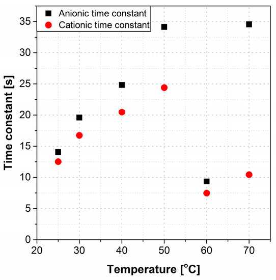 Experimental data confirmed two distinct deformation patterns for cationic and anionic curvatures, suggesting that each is differently affected by temperature. The magnitude of the cationic curvature exhibited an inversely proportional dependence on temperature as the temperature was increased from 25 °C to 70 °C (Figure 3a); while this correlation for anionic curvature was a direct correlation up to 50 °C followed by a sharp drop at 60 °C and increase at 70 °C (Figure 5). The irregular behavior of the anionic curvature was also observed for time constants of both cationic and anionic curvatures (Figure 7).