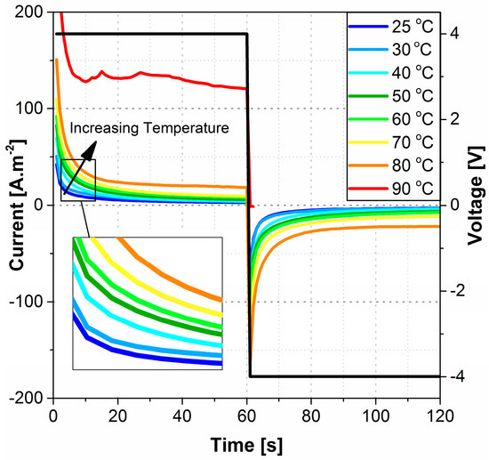 Presented in Figure 8 is the time dependent current flow measured at different temperatures. Despite the lack of electromechanical response at temperatures higher than 70 °C, electrochemical behavior of the actuators followed a constant pattern up to 80 °C, and exhibited a jump along with a relatively flat (time independent) high current flow at 90 °C indicating physical and/or chemical degradation of the actuator. The system then completely failed after about 60 s at 90 °C when the current flow dropped to zero.