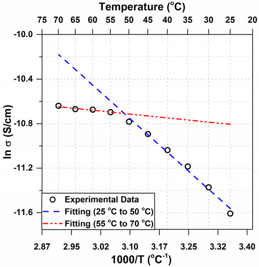 where σ is the ionic conductivity, t is the thickness of the membrane, Rm is the resistance deduced from the Nyquist plots at high frequencies, and A is the surface area of the membrane [31]. After that, the Arrhenius equation in its linear form Equation (3) was used to fit the experimental at different temperatures: